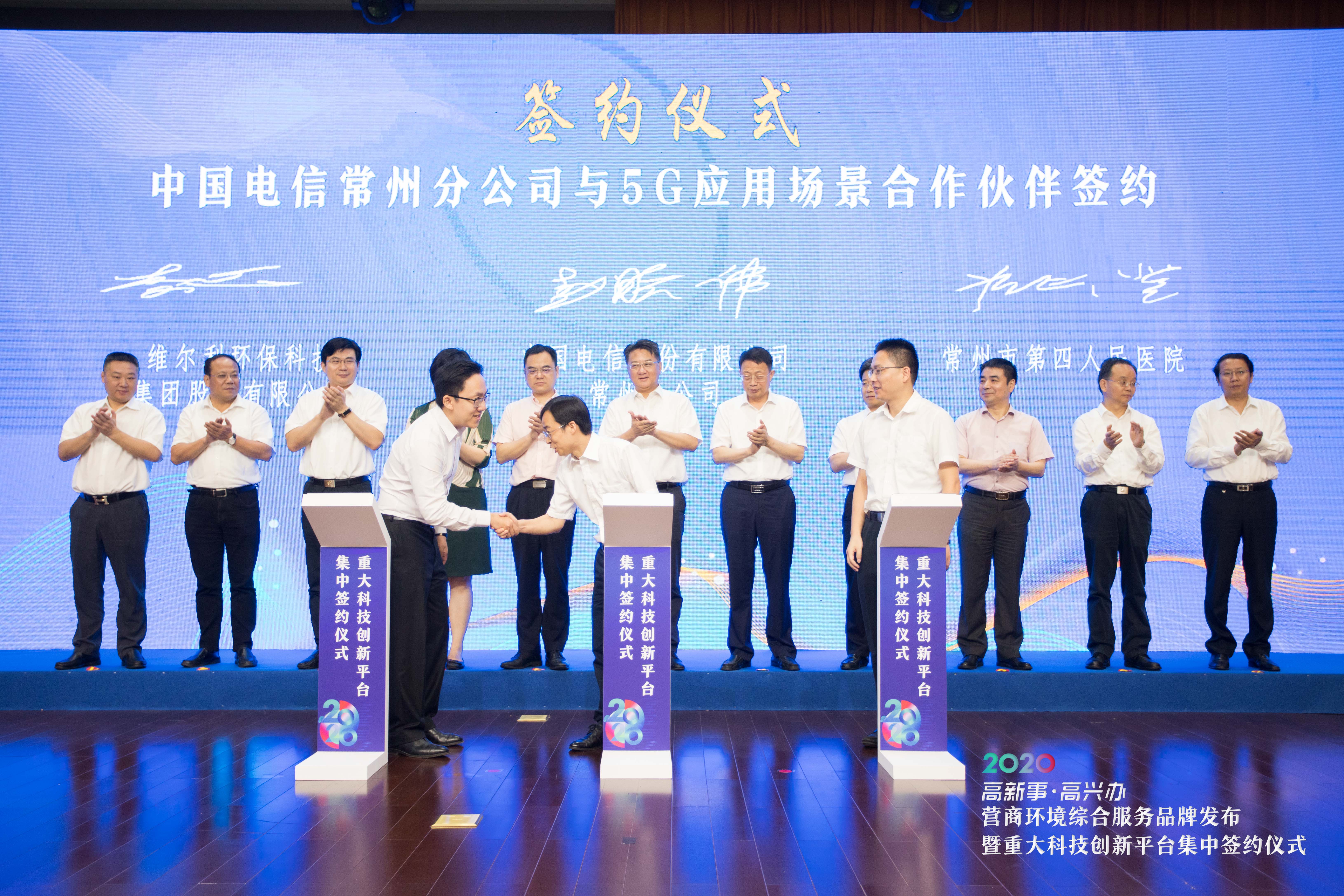 7月18日上午,在常州國家高新區(qū)舉辦的營商環(huán)境綜合服務(wù)品牌發(fā)布暨重大科技創(chuàng)新平臺集中簽約儀式上,維爾利環(huán)保科技集團(tuán)股份有限公司(以下簡稱:維爾利集團(tuán))與中國電信股份有限公司常州分公司(以下簡稱:常州電信)簽訂了企業(yè)5G+工業(yè)互聯(lián)網(wǎng)項(xiàng)目建設(shè)及應(yīng)用戰(zhàn)略合作協(xié)議。