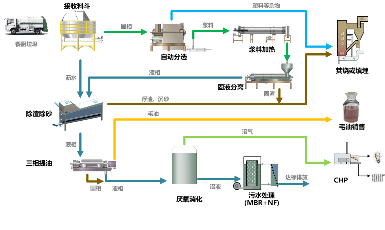 為了更充分的提取油脂以及把有機(jī)質(zhì)轉(zhuǎn)化成沼氣,餐廚垃圾首先要經(jīng)過 “自動(dòng)分選-漿料加熱-固液分離”等一系列工藝處理。