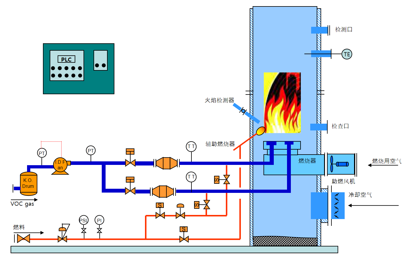 VCU設(shè)備是把產(chǎn)生的VOC氣體引入到燃燒煙囪內(nèi)在800~1000℃下完全燃燒之后,分解為無害、無臭的清潔氣體排放到大氣中的環(huán)境治理設(shè)備。