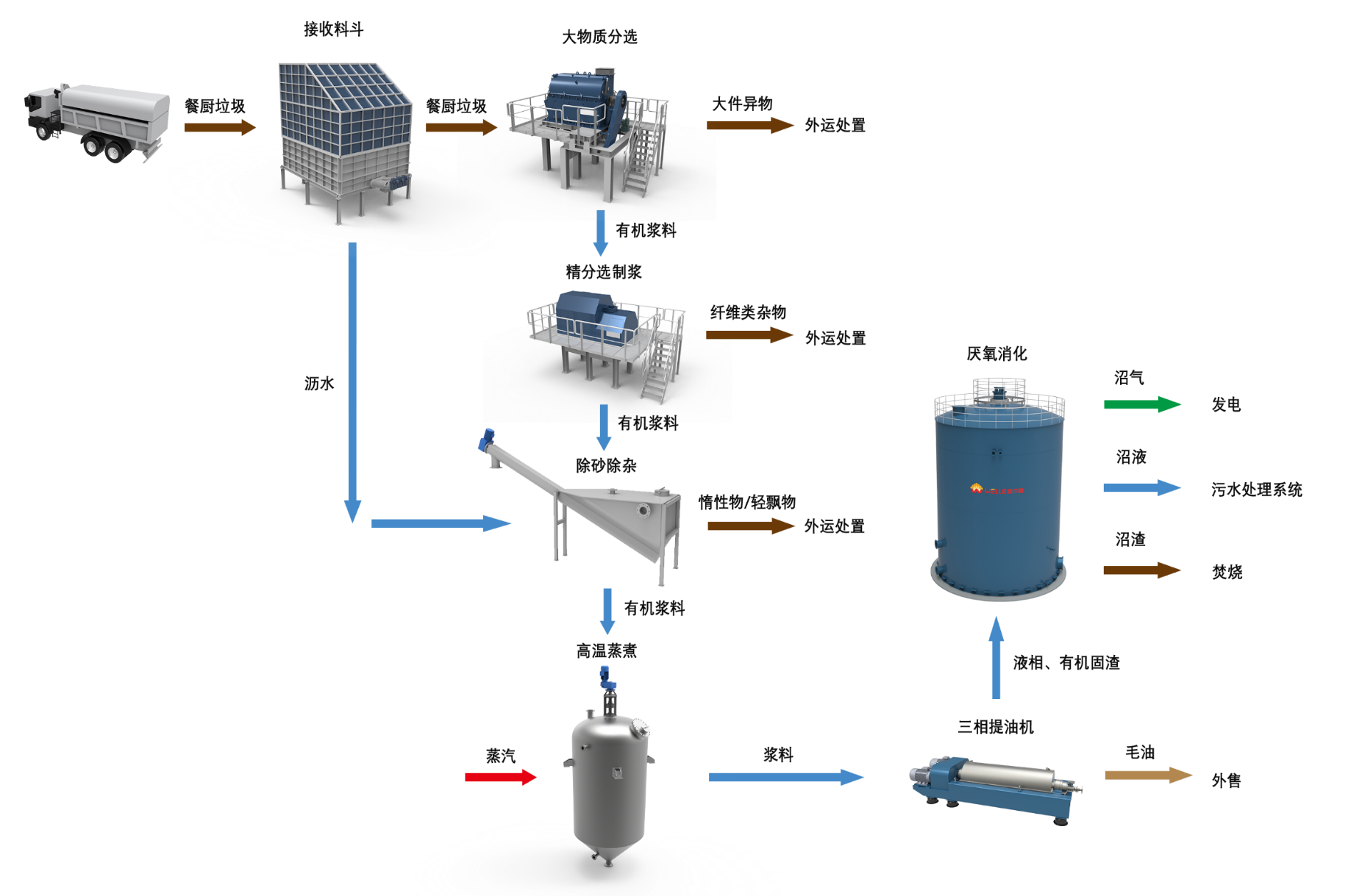 結(jié)合一期項目的運營經(jīng)驗,充分考慮到餐廚垃圾的特點和處理難點,二期項目采用“機械預處理+厭氧發(fā)酵+沼氣發(fā)電+污水處理+除臭處理”終端處置工藝,該工藝在減少處置過程中固渣、廢水、臭氣等污染物的同時,充分有效地分離餐廚垃圾中的有機質(zhì)并對其進行資源化利用,實現(xiàn)了餐廚垃圾中油脂的最大化資源回收。